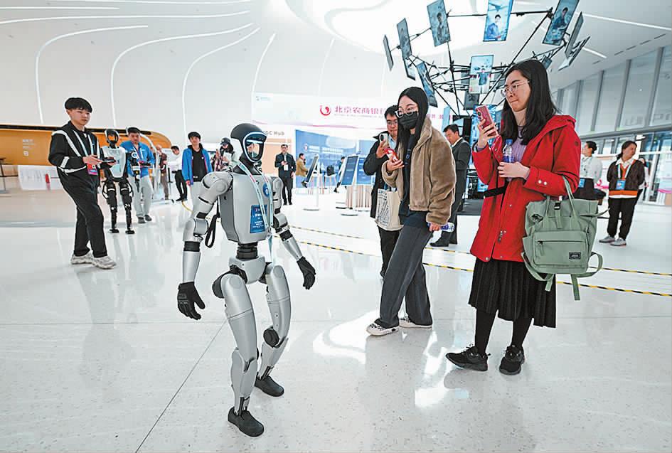 3月26日,中关村国际创新中心的一款正在行走的宇树G1机器人吸引人们拍照留影。 新华社记者 陈钟昊 摄