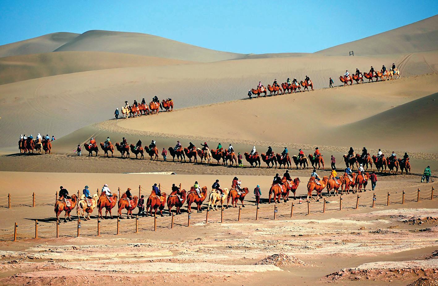 4月5日,游客在甘肃省敦煌市鸣沙山月牙泉景区游览。文化和旅游部4月7日公布2025年清明节假期文化和旅游市场情况。经文化和旅游部数据中心测算,假期3天,全国国内出游1.26亿人次,同比增长6.3%;国内出游总花费575.49亿元,同比增长6.7%。