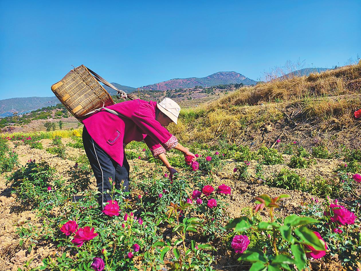 近日,易门县浦贝乡罗台旧村的食用玫瑰竞相绽放,田间地头随处可见群众采收玫瑰的身影。据悉,经过多年发展,罗台旧村食用玫瑰种植已成规模,目前全村10个村民小组300余户农户种植食用玫瑰1600余亩,食用玫瑰种植已成为当地群众增收的支柱产业。 通讯员 薛韵秋 摄