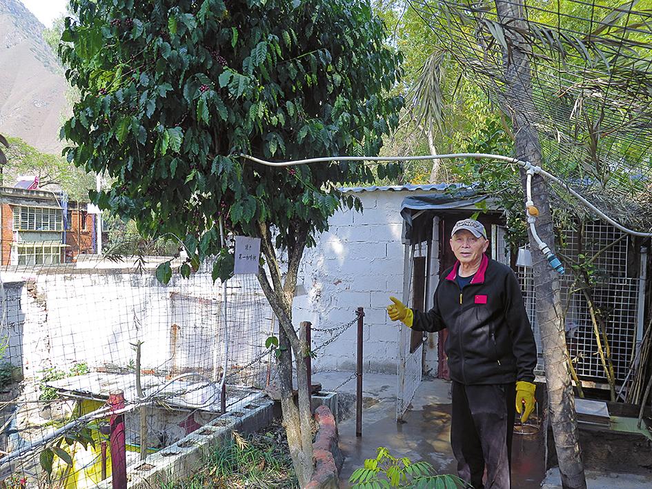 从保山潞江坝带回的咖啡苗 1971年,龚国华到保山潞江坝运输大米,途中遇到一位陌生人搭车,好心的龚国华让他上了车,方知这位路人名叫李茂盛,是潞江坝农场的职工。路上,龚国华看到农场的人正在移栽一种自己从来没有见过的小树,心生疑惑。李茂盛笑着告诉他,那是当地有名的咖啡树。虽然龚国华以前在电影里看到过坐在咖啡馆里喝咖啡的时尚场景,但自己从来没有见过咖啡树。现在,见到这种神秘的树种,这个祖籍贵州的老矿工带着强烈的好奇心问:“多少钱一棵?”李茂盛笑着说:“你要的话,不要钱,我让农场送你一棵。” 龚国华把从李茂盛处要来的咖啡树放到车上的小桶里,装上松软的泥土,洒上清水,一路小心翼翼地带回绿汁,从此创造了这棵热带作物在小镇上半个多世纪的传奇。 龚国华家住在绿汁一号楼8号房,他家正对门则是矿工何志军家的1号房。一号楼后面有两层狭长的台地,种着花草,龚国华就把带回的咖啡树种在了上面一层的空地上。挖树坑时,他用矿区废弃的石灰渣和当地的红土,拌入腐殖土,形成透气渗水的基质,既保肥又防板结。他用土法炮制农药,清除树上的病虫害。为了给树施肥,他将鸡粪、羊粪等农家肥发酵……这棵咖啡树在他的精心照料下顽强生长。龚国华的儿子龚乾坤说:“我比这棵咖啡树大一岁。我记得,在我四五岁的时候,这棵咖啡树开始开花,隐约能闻到一丝淡淡的香味。等到结果时,我看到咖啡果呈椭圆形,初为青绿色,成熟时为红色。成熟的咖啡果外形看起来像樱桃。此时,一号楼里的孩子们就围拢过来,看着父亲如何烘炒咖啡豆。虽然咖啡喝着是苦的,但这些温馨场景,却成了我们这些矿山子弟独特的童年记忆。”