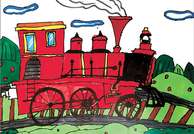 点评:小作者采用写实手法,用线条与色彩组合绘制出心目当中的蒸汽火车。作品在色彩上大胆使用鲜明的红色,并勾勒出车轮、烟囱、轨道等部件,让蒸汽火车在画面中成为视觉焦点,给人强烈的色彩冲击。