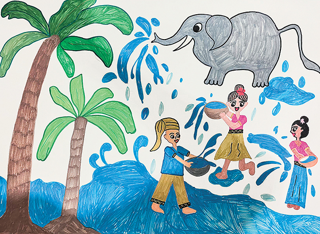 点评:画面中,人们相互泼水,大象也参与其中,尽情享受节日的欢乐……小作者通过细腻的笔触和适宜的色彩,再现了节日的欢乐气氛和傣族人民的热情与活力,这是一幅生动描绘傣族泼水节热闹场景的绘画作品,向观者传递泼水节的魅力与美好。