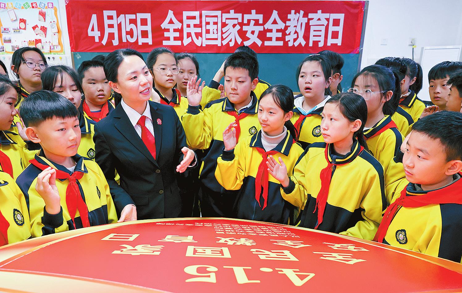 4月14日,山东省枣庄市市中区人民法院法官在东湖小学宣传国家安全相关法律法规。