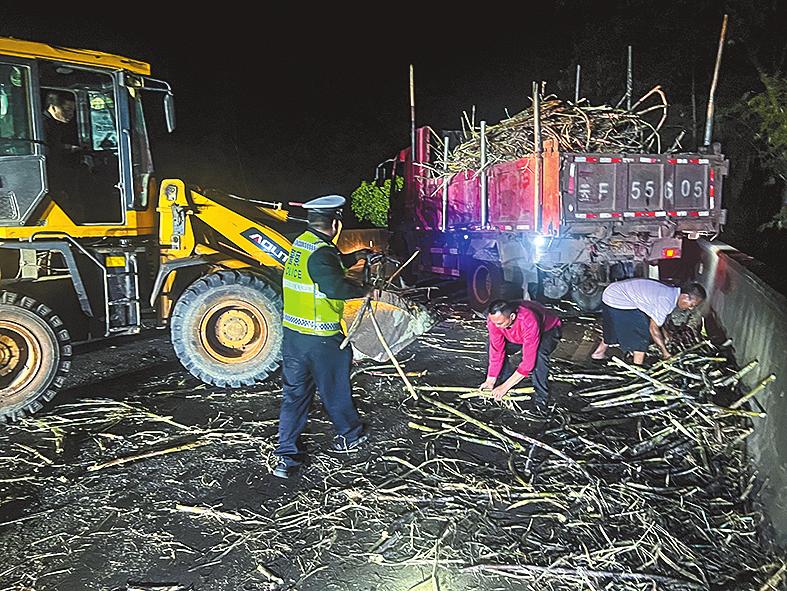 本报讯(通讯员 普开福 周兴瑞 文/图)近日,新平县公安局戛洒派出所民辅警及时清理散落在公路上的甘蔗,消除安全隐患。 3月25日晚8时,戛洒派出所民辅警巡逻到戛洒辖区新三公路磨刀村路段时,远远看到前方道路右侧有大量成捆甘蔗散落,周围未摆放警示标志,不时有车辆从旁边呼啸而过,情况十分危急。 由于此处车流量较大,且夜间视线不好,为防止过往车辆躲闪不及造成交通事故,民辅警及时做好交通安全防护,准备清理甘蔗。此时,拉甘蔗的货车驾驶员也驾车赶回。原来,货车驾驶员把车里的甘蔗卸了才折返回来。民警教育货车驾驶员后,一边帮助驾驶员将甘蔗清理至货车上,一边引导过往车辆驾驶员注意避让。 半个小时后,路面被清理干净,交通也恢复正常。货车驾驶员紧紧握住民警的手说:“谢谢你们,要不是你们及时帮忙,我一个人不知道要搬多久。” |