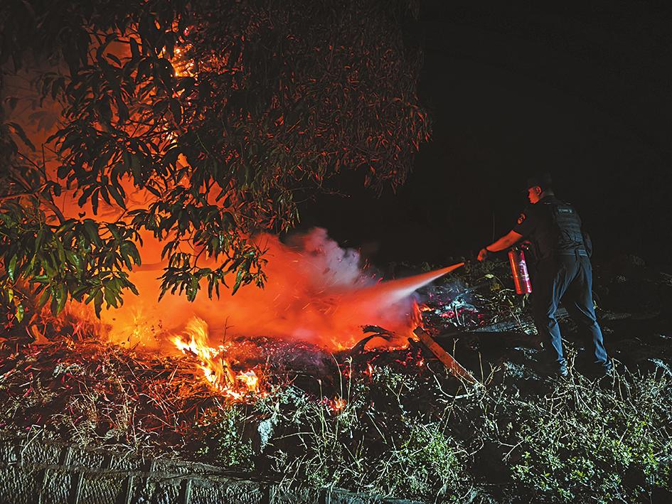 本报讯(通讯员 张秋婷 文/图)4月10日23时许,元江县公安局特巡警大队在前往南洒堵卡点执勤途中,发现前方路边冒出滚滚浓烟。特巡警队员立即查看情况,发现是路边草丛起火,火势随着大风逐渐增大。而距离着火点不远处就是成片的芒果林,若不及时扑灭,后果不堪设想。 为防止火势持续蔓延,特巡警队员立即从车中拿出灭火器,并就地取材,用沙土、树枝等灭火。但因天干物燥,加之大风天气,火势刚被压下去又开始复燃。此时,南洒收费站的消防小队携带灭火装备赶到现场。经过半个多小时的合力扑救,火终于被扑灭,及时消除了芒果林大面积起火的风险。 为防止复燃发生,特巡警队员反复仔细检查着火点,确保无复燃的可能后,才撤离现场,继续开展执勤工作。 |