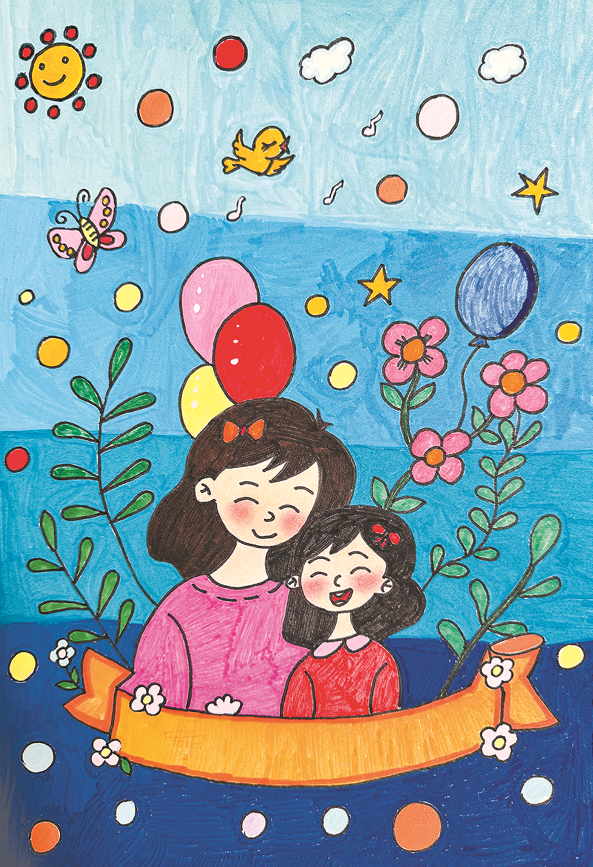 点评:飞鸟、花朵、气球、蝴蝶、相拥而笑的母女……作品将自然元素与人物结合起来,以大胆的色彩、自由的线条,勾勒出一个温暖和谐的画面,传达出强烈的情感。