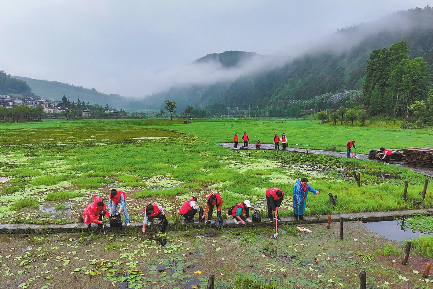 6月4日,新时代文明实践志愿者在云南省腾冲市西源街道盈水村湿地公园清理垃圾(无人机照片)。