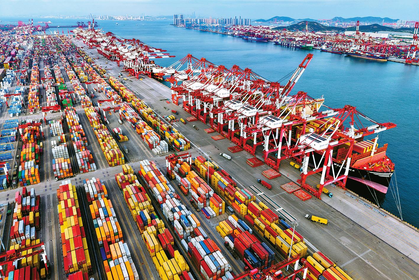 5月5日,在山东港口青岛港,货轮在装卸外贸集装箱(无人机照片)。