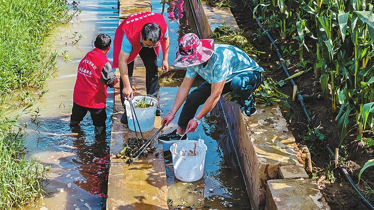 近日,江川区宁海街道组织开展福寿螺专项清理行动,设置5个沿湖清理点,组织各个点位的村(社区)干部等对辖区内福寿螺易滋生区域展开地毯式排查清理。同时,清理人员还对河道沟渠的垃圾进行了清理,并向周边村民普及福寿螺的危害及防治知识,引导村民积极参与福寿螺的清理工作。活动当天,共清理福寿螺及卵块90.6公斤。 特约通讯员 陈然 摄