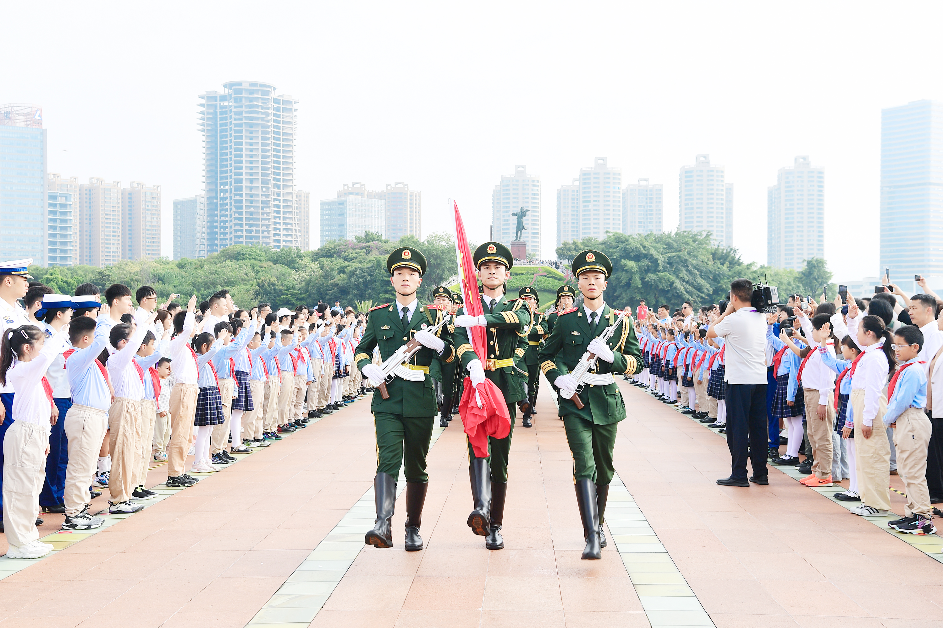 同升国旗 同唱国歌 缅怀先烈弘扬爱国精神 上午8点30分,武警玉溪支队国旗护卫队迈着铿锵有力的步伐,将国旗送至升旗台。聂耳广场上,参与活动的嘉宾、市民纷纷转身,将视线聚焦,迎国旗而立,全场庄严肃穆。“升国旗,奏唱国歌”在主持人洪亮的口令下,中国人民解放军军乐团原团长、国歌立法推动者于海指挥军乐队,奏起了《义勇军进行曲》。鲜艳的五星红旗迎风飘扬,一句“前进!前进!前进!进!”富有力量的国歌声响彻聂耳广场。 活动现场,于海还指挥军乐队,与全场参与活动的嘉宾、市民共同唱响《歌唱祖国》,纪念中国人民抗日战争暨世界反法西斯战争胜利80周年,以歌声缅怀先烈,弘扬伟大爱国主义精神、伟大抗战精神。 “今年是中国人民抗日战争暨世界反法西斯战争胜利80周年,《义勇军进行曲》公开发表90周年,在这个特殊节点举行此次活动非常有意义。爱国,要从唱好国歌开始。”于海表示每次来玉溪,站在国旗下指挥升旗仪式都有不同的感受,也见证了玉溪人民对聂耳的深厚感情。 “今天早上我们和玉溪人民一起,在聂耳的故乡,参加了升国旗仪式,共同唱起了《义勇军进行曲》。我非常荣幸、骄傲和激动。”田汉基金会秘书长、田汉之孙欧阳维表示,“《义勇军进行曲》将永远激励着我们奋勇向前。未来,我们将继续与玉溪人民、云南人民和全国人民一起,把我们的国歌唱响。”