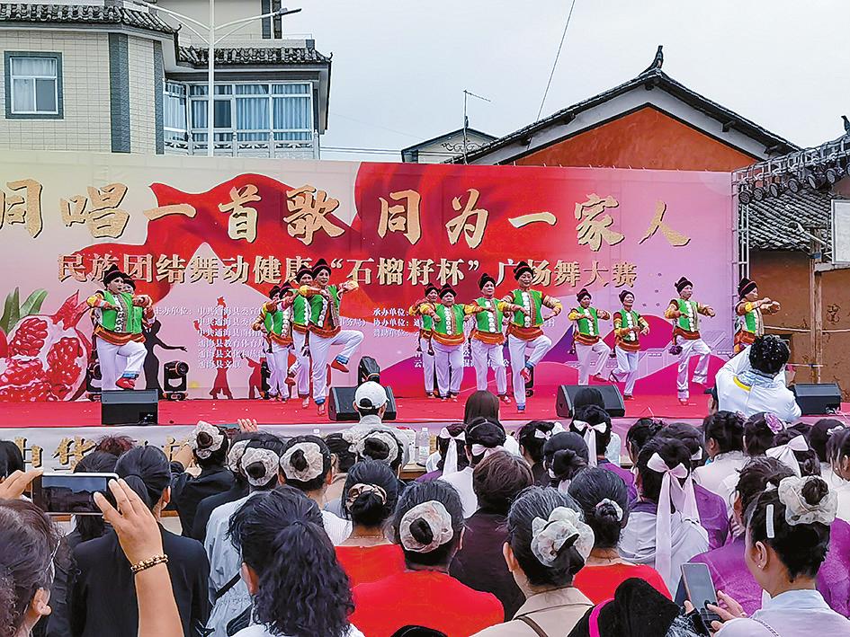 近日,通海县在兴蒙乡桃家嘴村举行了首届“石榴籽杯”广场舞大赛。来自全县26支代表队的300余名舞蹈爱好者齐聚一堂,以舞为媒,共叙民族团结情谊,用饱满热情展现了新时代各族群众的良好精神风貌。