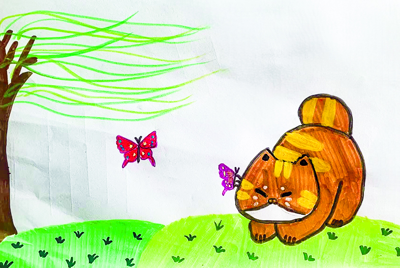 点评:小作者挥动手中画笔,简要勾勒出萌猫树下扑蝶的生动场景:飘动的树枝,翻飞的彩蝶,憨态可掬的萌猫……整幅作品简洁灵动,颇有意趣。