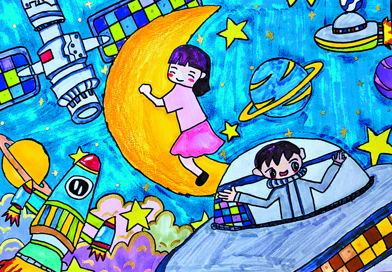 点评:小作者以深邃的蓝色太空为背景,营造出宇宙的神秘感,再挥动稚嫩画笔描绘星际旅行、生命互动等情境,并在其中增加更多星体、飞船等内容,使空间感、层次感更丰富。作品整体构图饱满,色彩绚丽,生动展现了青少年对航天、宇宙的浪漫想象。
