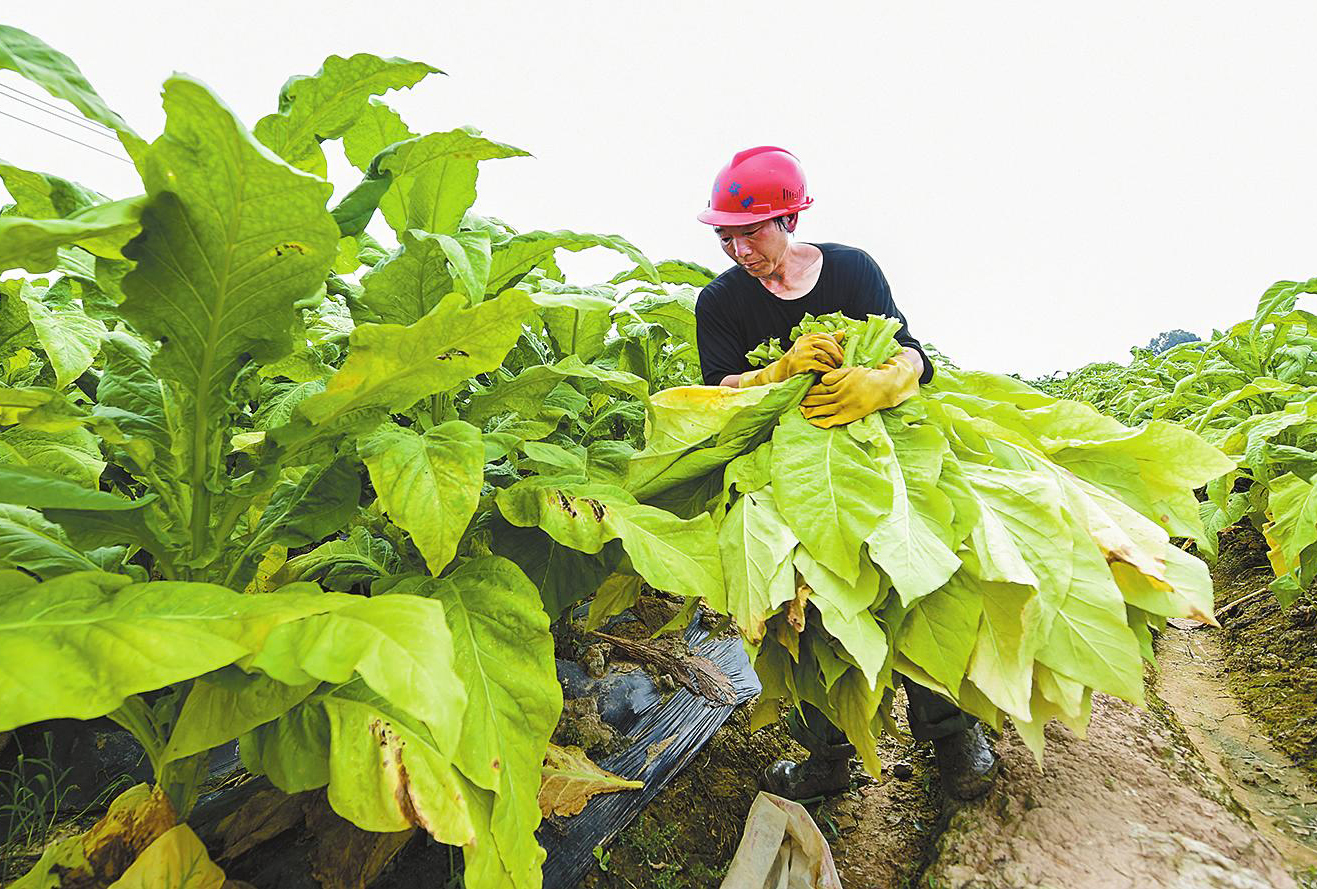 日前,江川区前卫镇赵官村烟农宋胜发在自家10亩烟田中忙着采摘烟叶。当前,玉溪市烤烟生产进入烟叶采摘烘烤阶段,各地烟农抢抓时令,在田间地头与烤房间有序“赶烤”,全力保障烤烟提质增效,实现丰产增收。