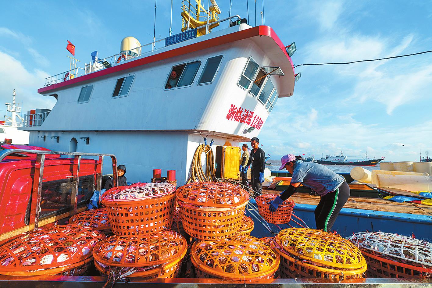 8月12日,开渔归来的渔运船靠泊在舟山沈家门舟山国际水产城码头,渔民把整筐的梭子蟹运送上岸装车。