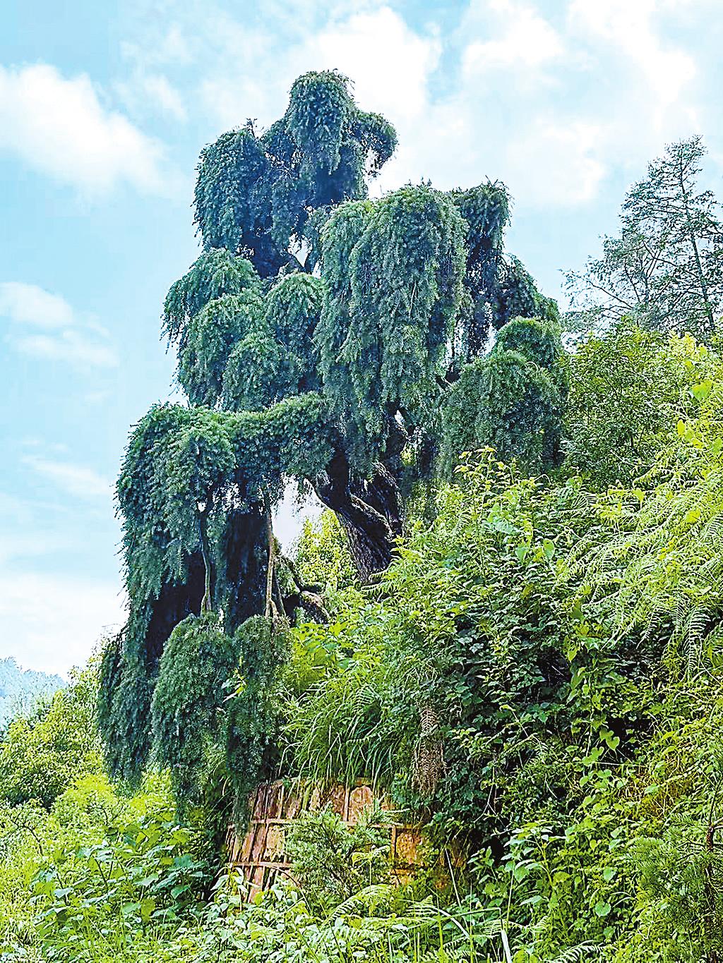 初见: 轻摇曼舞尽显灵动之美 初秋,雨后初晴,空气中弥漫着泥土与草木混合的清新气息。沿着一条蜿蜒曲折的山路前行,远远便能望见山间一抹格外醒目的翠绿,那便是华宁特有的珍稀树种——当地人口中的“蓑衣龙树”。 初见蓑衣龙树,记者便能感受到它与众不同的魅力。其造型优美,苍老遒劲的树干宛如游龙,修长的枝条从树冠披卷而下,枝条上密生的扁平线叶层层叠叠,一眼望去,整体外观神似一件可遮风挡雨的“蓑衣”,蓑衣龙树由此得名,既形象又满含乡土温情。 记者来到一株分杈奇特的蓑衣龙树前,四组丫杈宛如一家四口彼此依偎,又各有姿态,透着自然的温情与奇妙。这株树高7至8米,东西冠幅约为南北冠幅的两倍。微风拂过,枝叶轻摇曼舞,尽显灵动之美。 记者问:“这株树在这里生长多少年了?” 华宁县湿地与野生动植物保护中心主任黄继东介绍,尽管树龄尚未经过专业的科学鉴定,但据村里老一辈人回忆,在他们儿时,这株树便已静静伫立于此。历经岁月的风霜洗礼,这株蓑衣龙树依旧姿态优雅地屹立着,宛如一位坚毅的守护者,默默见证着这片土地的变迁。 溯源: 国内独一无二的遗传种质资源 这一山间古树何时有了科学的“身份”呢?据黄继东介绍,1982年5月,西南林学院薛纪如教授到此地考察后,将其鉴定为云南油杉新变种,定名为“蓑衣油杉”,这在国内尚属首次发现。 蓑衣油杉与云南油杉的区别十分显著:蓑衣油杉主干弯曲且封顶,树皮较坚硬,木栓层不发达;枝条修长而下垂,球果初时向上,成熟后下垂,果鳞先端显著外翻,背面带有锈色微毛;苞鳞先端有三瓣裂片,两侧浑圆,中间一瓣裂片较小而下陷,种翅中部较宽。其树形优美,四季常绿,不仅具有极高的观赏价值,更是珍贵的遗传种质资源,如今原生植株十分稀少,就愈发显得珍贵。 这一兼具观赏价值与科研价值的珍稀树种,已被列入《云南省极小种群野生植物保护名录(2022年版)》。2024年,云南省林业和草原局公布云南省林木品种审定委员会2023年良种认定结果,华宁县蓑衣龙树(云南油杉)通过良种认定,并被收录至省林木良种名录,进一步凸显了其独特价值。