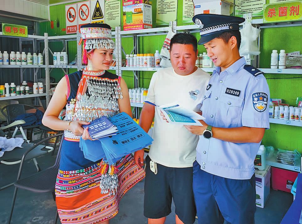 近日,新平县公安局漠沙派出所组织花腰傣志愿者开展反诈、反有组织犯罪宣传活动。民辅警结合近期高发的电信网络诈骗案例,向群众讲解常见电信网络诈骗的作案手段和防范要点,提醒商户及过往群众“不轻信、不透露、不转账”。花腰傣志愿者向群众发放反诈手册、引导群众下载“国家反诈中心”App,扩大宣传覆盖面。 通讯员 陈猛 摄