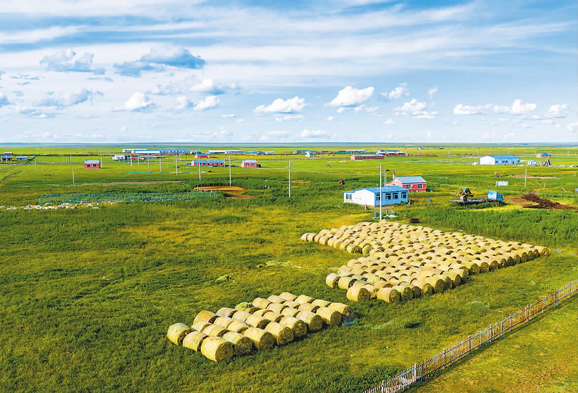 初秋时节,内蒙古呼伦贝尔大草原草色渐黄。在辽阔的草原上,牧民将丰收的牧草捆扎成卷,成群的牛羊、马匹漫步其间,勾勒出一幅祥和美丽的秋日丰收图景。