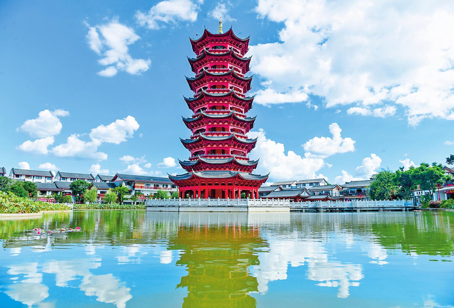 蓝天白云下,位于红塔区大营街幸福小镇的凤凰楼临水而立,倒影绰约。 一、二、三期工程建成后,幸福小镇打造出乡村活态集市体验区、乡村民俗体验区、乡村美食街等区域,还配套建设了汇溪记忆展览馆、映月潭体育运动公园等文体设施。2024年,幸福小镇入选“第一批云南省金牌旅游村”,“百翠街”开街运营,同时成功举办“有一种叫云南的生活——玉溪村节”等特色节庆活动,实现旅游收入498万元,各级主流媒体联合直播总曝光量超1800万,文旅等功能融合作用凸显。