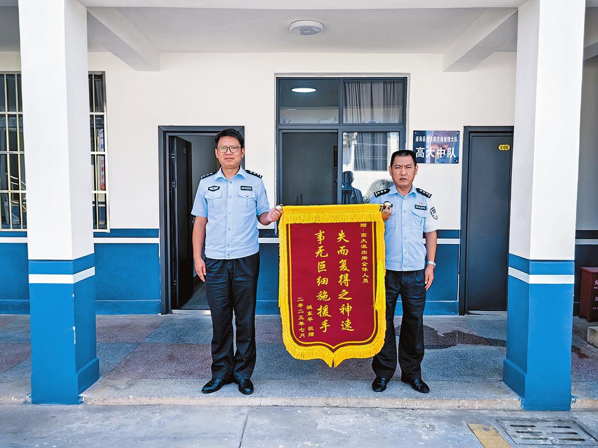 本报讯(通讯员 郭栩君 岳斌 文/图)“警察同志,辛苦你们了,帮我找到丢失的轮胎,挽回了5000多元损失。”姚先生握着通海县公安局高大派出所民警的手感激地说。 7月14日凌晨,姚先生驾驶货车途经高大辖区时,两个轮胎意外脱落。因货车轮组较多,姚先生并未察觉异常,抵达通海县城后才发现轮胎丢失。心急如焚的姚先生立即调取行车记录仪查看,锁定轮胎脱落的大致路段,随即原路返回寻找,但未能发现轮胎踪影,于是报警求助。 高大派出所接警后迅速行动,沿路仔细搜寻,找了半天也未发现轮胎踪影。民警通过多方查找,发现轮胎被一群众捡拾。经民警耐心沟通,该群众表示愿意归还轮胎。在派出所民警的陪同下,姚先生顺利取回了丢失的轮胎。 7月28日,为了表达感激之情,姚先生将一面印有“失而复得之神速 事无巨细施援手”的锦旗邮寄到高大派出所。 |