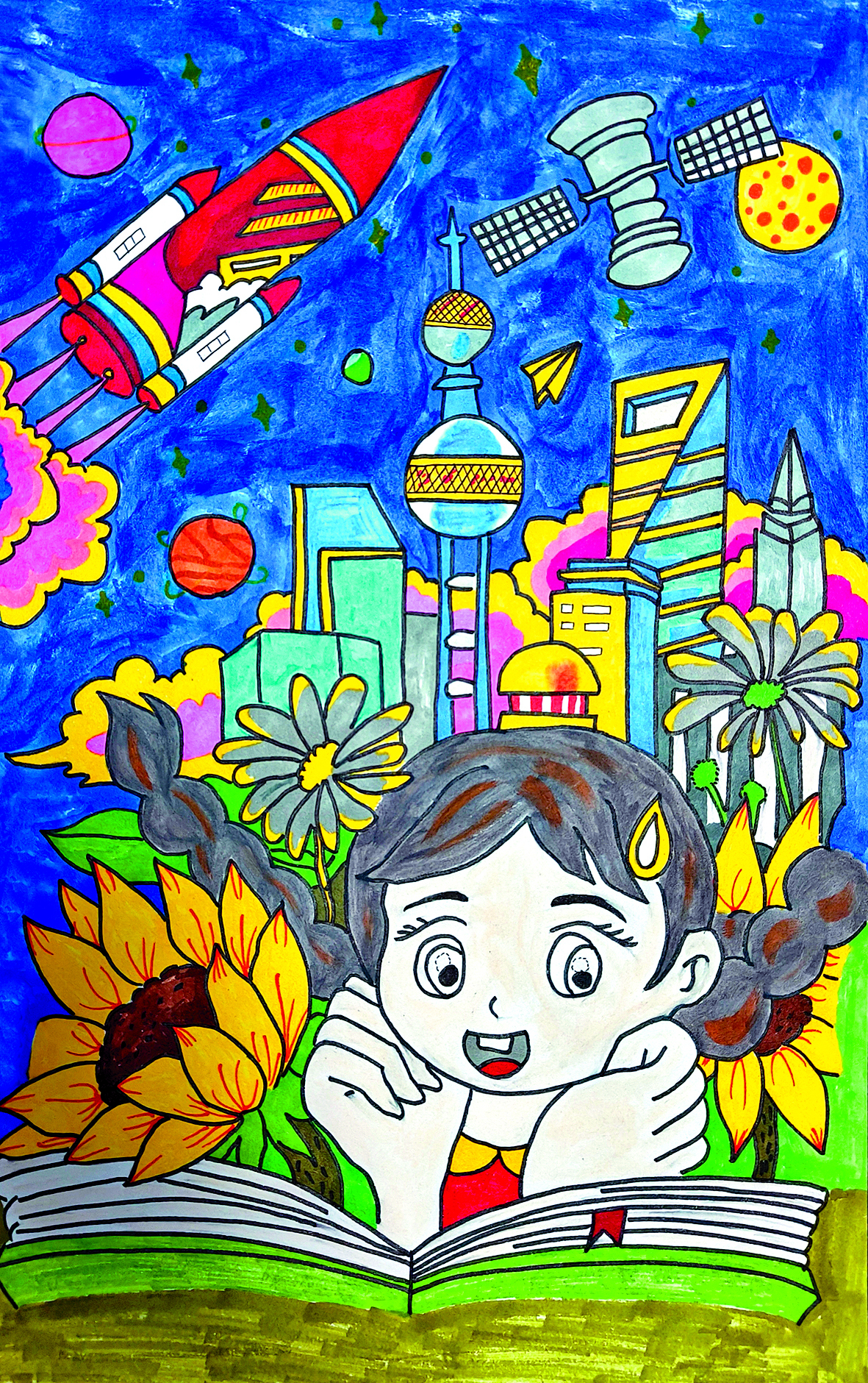 点评:小作者将画面最前方摊开书本认真、愉快阅读的女孩与航天、花朵、蓝天、高楼等丰富的背景元素合理组合、描绘,让画面具有层次感。作品色彩鲜艳,小女孩“飞起”的麻花辫、滴落的汗珠、愉悦的表情等细节处理让画面显得生动活泼。