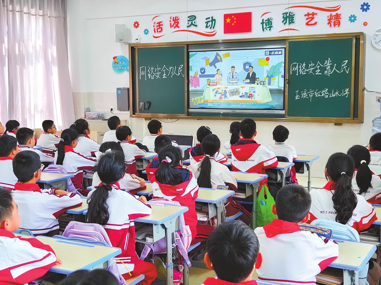 本报讯(记者 冯天娇 文/图)9月16日,玉溪市红塔山水小学开展2025年国家网络安全宣传周校园日活动。活动紧扣“网络安全为人民,网络安全靠人民”主题,将网络安全教育融入校园日常,提升师生网络安全意识和防护技能。 “不能随便点击陌生链接,也不能轻信网上陌生人,还要保护好自己的家庭住址和电话号码。”在六年级8班教室,学生史芯谣刚看完校园日主会场网络安全宣传教育公开课视频,便和同学分享收获。当天,该校组织各班级通过云南教育公共服务平台观看网络安全宣传教育公开课视频,视频中专业的讲解与生动的反诈案例,让师生直观了解网络安全风险,进一步强化自我保护意识。 为让网络安全知识“入脑入心”,学校还将网络安全教育融入日常教学环节。信息技术课上,教师结合“虚假游戏充值”“仿冒社交账号”等学生身边常见的网络安全案例,向学生详细讲解如何辨别网络信息的真伪,以及个人信息保护、防范网络诈骗等实用知识,帮助学生理解网络安全的内涵要义,掌握基础防护技能。主题班会上,班主任组织学生围绕“绿色上网,健康成长”展开讨论,学生们踊跃发言,在讨论与互动中深化对网络安全的认知,明确规范网络行为的重要性。此外,学校还利用电子屏滚动播放“共建网络安全 共享网络文明”等宣传标语,让网络安全理念渗透校园每个角落,营造浓厚的宣传氛围。 “网络安全是校园安全的重要一环,更是培养学生良好素养的关键一课。”学校相关负责人表示,此次活动不仅让师生学会识别、预防网络风险,更让大家深刻认识到网络安全与国家安全、网络健康发展的紧密联系。学校将持续推进网络安全教育常态化,为学生打造安全、健康的成长环境。