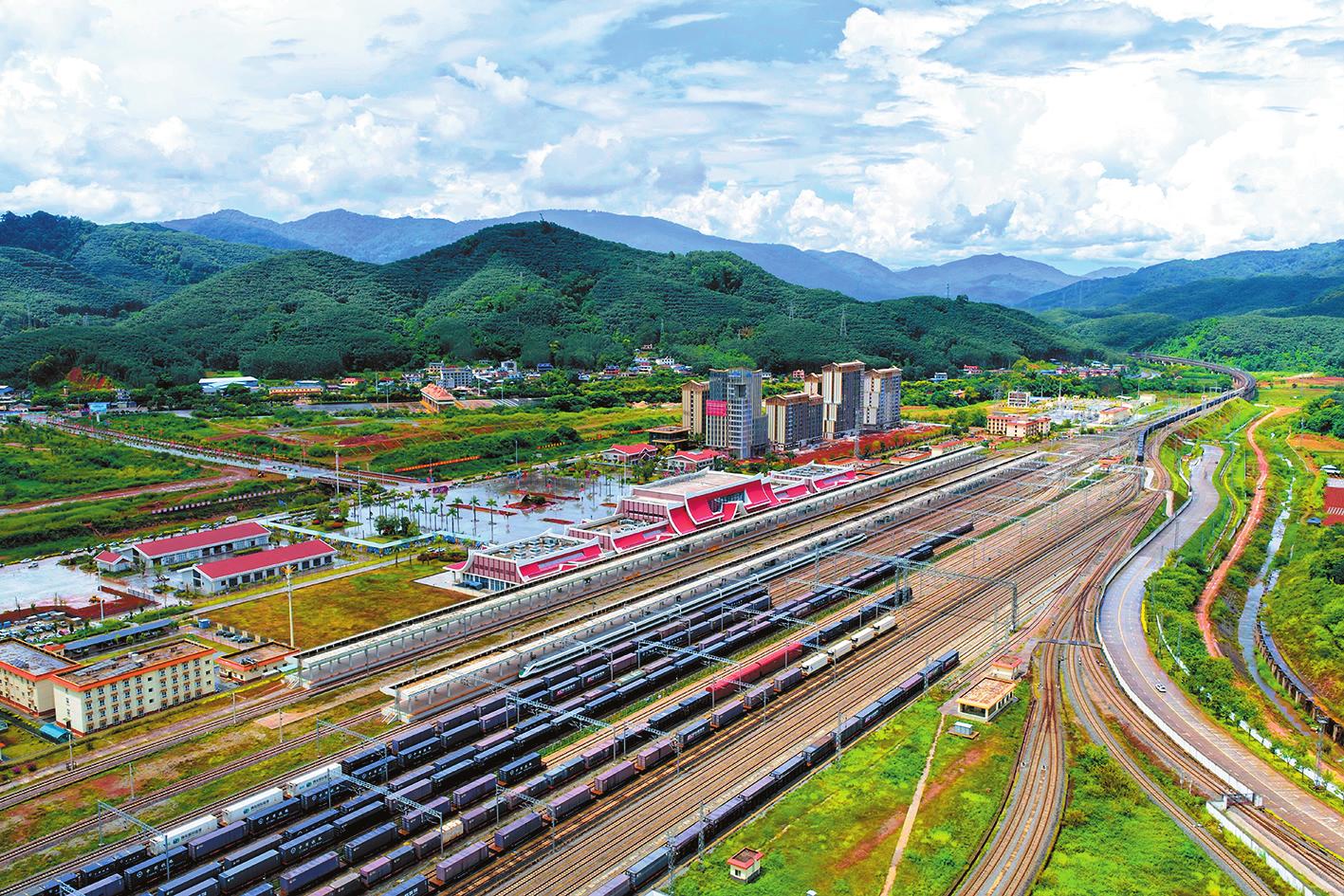 9月21日,中老铁路上的货运列车在磨憨站通过(无人机照片)。
