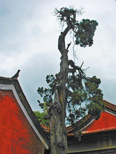 在通海县河西文庙南侧,至今屹立着一棵穿越千年时光的唐柏。它植于唐代贞观年间,历经1300余年风霜,见证过杞麓湖的渔舟系缆,聆听过明清学子吟诗诵文,更以奇特的建筑格局彰显着古人“让屋护树”的生态智慧。2023年,这株被誉为“活化石”的古树在完成自然生命周期后枯亡,但它的生命故事并未终结——由树上落下的种子生长出幼苗,现已蔚然成荫,以参天之姿延续着千年文脉,演绎着一场跨越时空的生命接力。 9月下旬,记者来到河西文庙,河西镇政府工作人员余庆高带记者观看了唐柏和他亲手移植的新一代柏树。他说:“唐柏历经千年岁月变迁,见证了无数风雨,是河西古镇历史的重要见证者,它的生命轨迹从葱郁到枯萎,再到以新的生命形式延续,谱写了一曲关于生命传承与历史记忆的动人乐章。” 千年岁月的守护者 河西文庙的唐柏,属名贵榛柏树种,据民国《续河西县志》记载,此柏树种于唐初,距今已有1300多年历史。元代建立文庙前,它已是当地远近闻名的古柏。相传古代杞麓湖水位高时,渔人常系舟于这棵柏树上,其树干粗壮,根围4.5米、高10米,虬枝婆娑,矫若游龙,“灵根拔地饶大力,逆披其干欲撑天”的古代诗句生动地描绘了它的雄姿。 自明清以来,有众多赞美唐柏的诗篇流传,明朝天顺年间举人王仪的《宫城古柏》便是其中的代表:“古色年深世不移,遗踪惟见岁寒姿。参天黛色经千载,卧壑苍髯傲四时。”字里行间满是对唐柏的敬仰与赞叹。它不仅是一棵古树,更承载着通海人民的情感与记忆,是当地历史文化的重要象征。 明朝成化七年(1471年),河西文庙从别处迁来重建于此,清朝光绪年间(1890年)又大规模扩建。古人为保护这棵唐柏,特意扩建南庑和西庑的一角,让它得以在文庙中继续生长,它也见证了文庙的兴衰与古镇的发展。 古树走到生命的尽头 然而,岁月无情,2023年,这棵历经千年风雨的唐柏,经林业部门鉴定已经枯亡。消息传来,通海当地百姓无不惋惜,这棵陪伴了他们一代又一代人的古柏,终究还是走到了生命的尽头。 但唐柏的故事并未就此结束。由于河西文庙是省级文物保护单位,唐柏作为文庙的一部分,具有重要的历史价值,不能随意砍伐。为防止它倒下造成安全事故,人们用钢绳将其固定,让它以一种特殊的方式继续“站立”在文庙之中。 余庆高,一名在河西镇政府工作了31年、即将退休的工作人员,对唐柏有着深厚的感情。据他介绍,20世纪80年代,为保护唐柏,人们砌了一个花坛将其围住;2009年下半年,又对花坛等设施进行了修缮。这些举措都是为了能更好地保护这棵古树。虽然唐柏已死,但它作为千年历史的见证,依然被保留下来,供后人凭吊、感悟。 唐柏的种子已长成大树 唐柏虽然枯萎了,但它的生命却以另一种方式得以延续。1994年,几颗从唐柏树上落下的种子长成幼苗,经刚刚工作不久的余庆高移植培育,如今已在文庙内长成了参天大树。 这些由唐柏种子萌发而来的树木,树干挺拔,枝叶繁茂翠绿,远远望去,如同一把把巨伞,为文庙增添了生机与绿意。它们与古老的唐柏遥相呼应,仿佛在诉说着生命的繁衍不息。 余庆高回忆,20世纪90年代他刚参加工作时,就将唐柏掉落的种子培育成苗,移栽到文庙内,一共栽了4棵。如今30多年过去,这些树最高的已超过10米,直径约40厘米,其中一棵遭水涝死亡,现存的3棵都生长旺盛。有游客曾说这些树有一百多年树龄,余庆高笑着纠正,说这些树都是他亲手栽种的,只有30多年的历史。这场美丽的误会,恰恰印证了唐柏生命力的强大。新树与古柏形成跨越时空的对话——老树虽枯犹立,新木已擎苍天,共同构成“生长千年,站立千年”的生态奇观。 站在河西文庙内,看着那棵枯萎却仍挺立的唐柏,再看看旁边那些由生机勃勃的幼苗长成的大树,让人不禁感叹生命的奇妙与历史的厚重。树影斑驳间,记者仿佛听到了明代诗人的吟唱:“君不见,阙里楷树历风霜,孤孑日值至人光。卓尔一身气至刚,直撑波澜于既狂。”唐柏虽已枯死,但却以另一种方式继续书写着属于这片土地的永恒传奇。即使生命终将走向终结,但只要有传承、有延续,历史就不会被遗忘,文化就能永远流传。 |