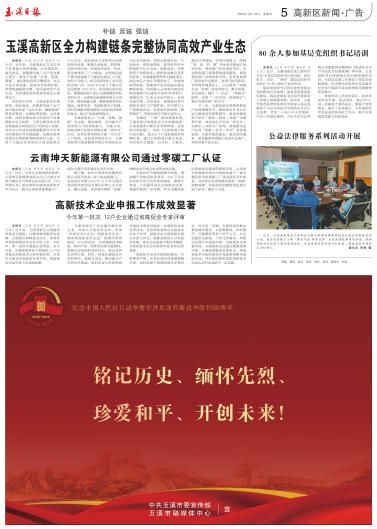 本报讯(记者 李文雯 通讯员 张庆田)近日,记者从玉溪高新区获悉,云南坤天新能源有限公司正式通过中国节能协会与华测认证有限公司(CTI华测认证)联合组织开展的高标准评价与认证,获评云南省首批零碳工厂。成为玉溪市首家通过认证的企业。 据了解,此次云南坤天新能源有限公司获评的是I型3星级零碳工厂。这是该公司继2024年12月在玉溪市成功发布连续式石墨化炉新工艺后的又一重大突破,是其落实国家“双碳”战略及省市相关要求的具体实践。 石墨化炉节能降耗提升改造、烟道烟气余热回收再利用、220千伏变电站和分布式光伏电站建设、数智化改造、产品碳足迹认证和绿色优美、高效环保的厂区环境,作为玉溪高新区零碳园区建设的重要内容,云南坤天新能源有限公司系统构建了一套完整而科学的零碳工厂建设指标评价体系。为园区企业贯彻落实国家“双碳”战略政策、实现绿色低碳转型发展打造了标杆,提供了示范。 |