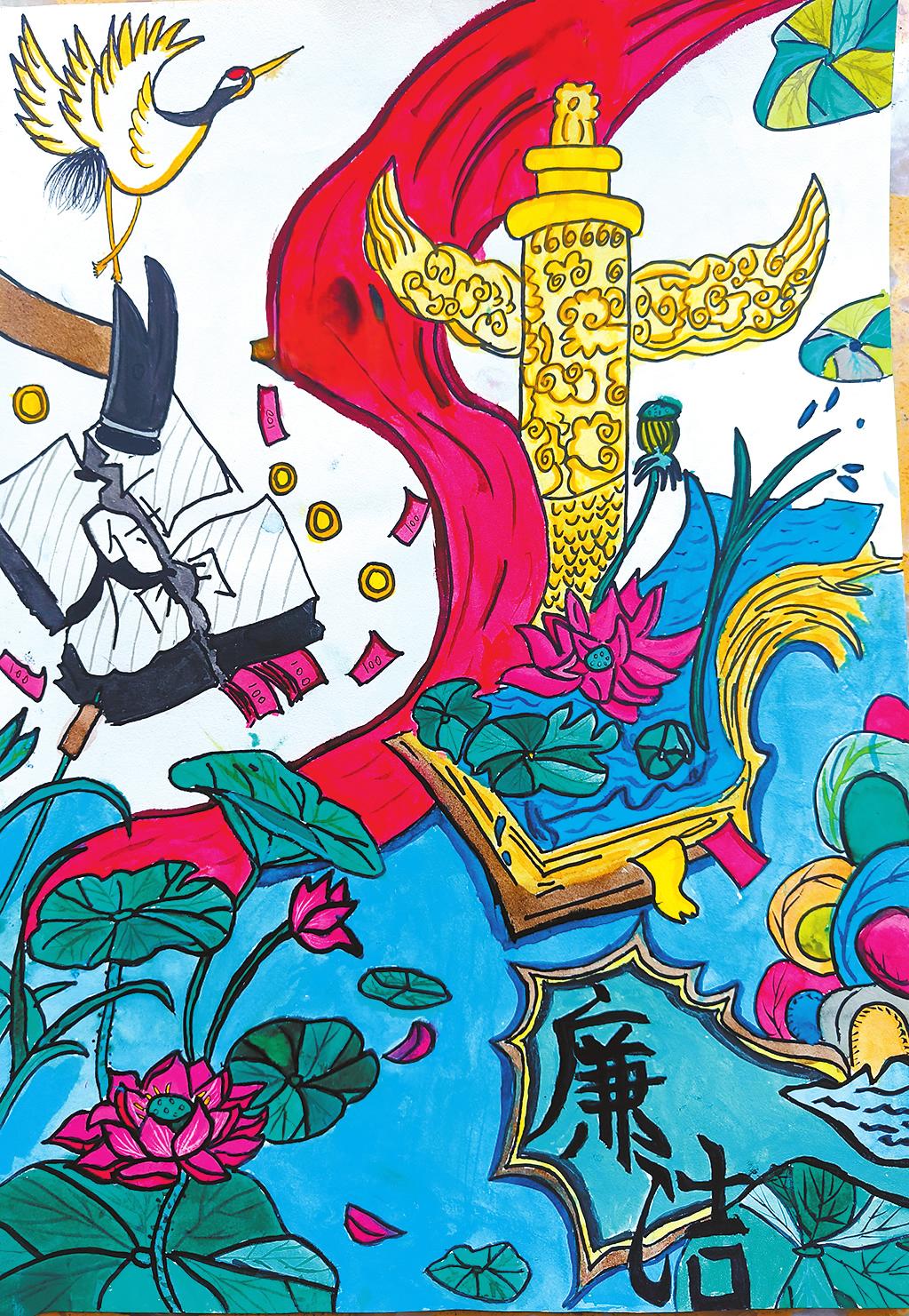 点评:铁锤砸碎的“腐”字,纯净高雅的荷花、白鹤、华表……作品以象征手法突出反腐倡廉主题,画面简洁明快,线条流畅,色彩鲜艳而沉稳,寓意着对美德的崇尚与追求,不仅在视觉上给人冲击,更在内涵上引发共鸣,给人深刻启示。