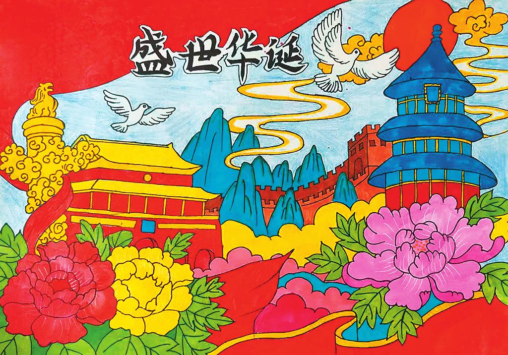 点评:作品以国庆为主题,用天安门、牡丹、万里长城、和平鸽、华表、红日等丰富元素展现祖国繁荣景象,充满热情与活力。整幅画作运笔流畅,端庄大气,祥和美好,节日氛围浓郁。