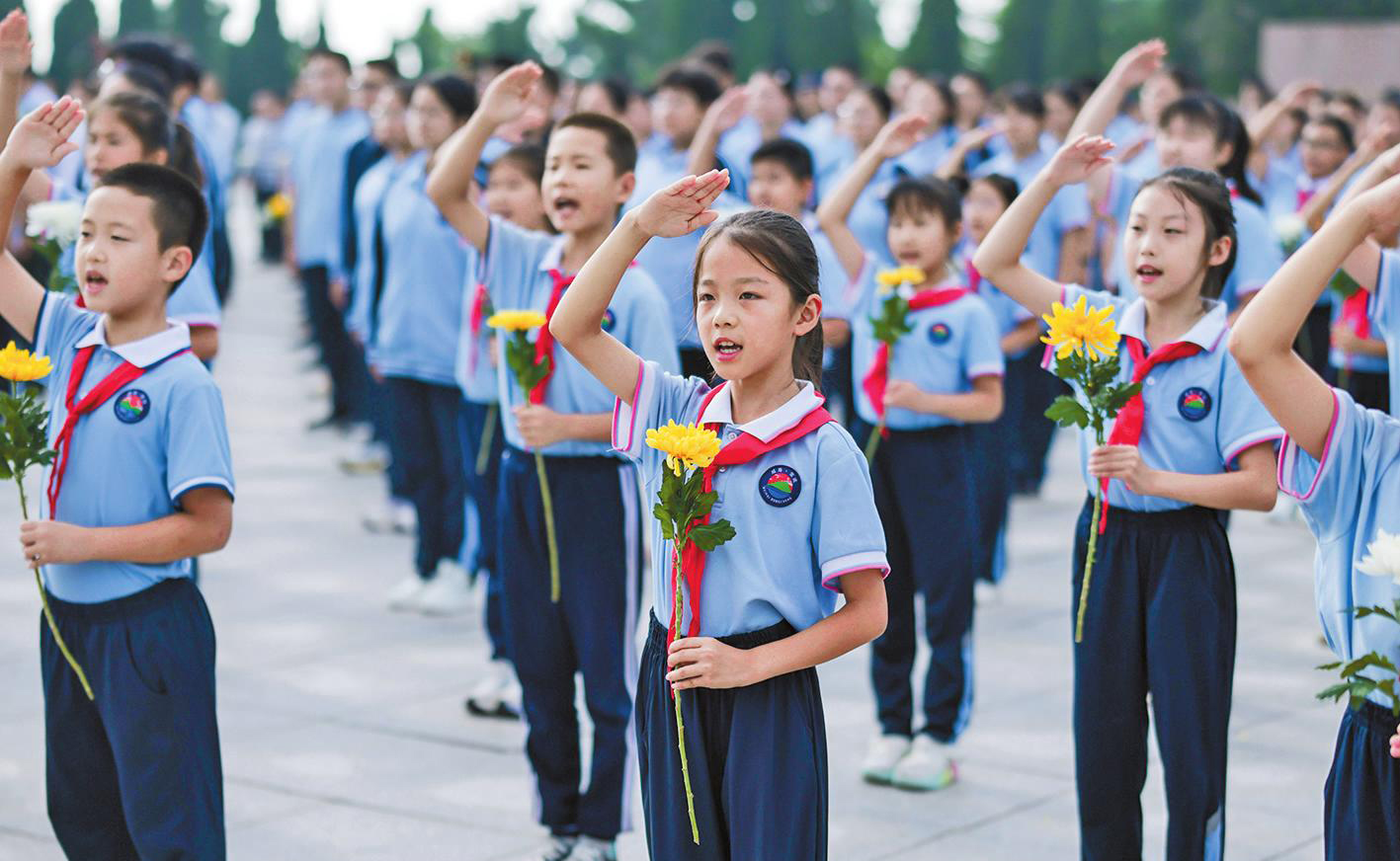 缅怀:以国之名致敬英烈 当东方曙光为人民英雄纪念碑镀上金边,亿万双眼睛注视同一个方向。被血色浸染的历史,在阳光下深沉回响。 9月30日上午,庄严的天安门广场,人们静静肃立,深情缅怀逝去的先烈。“人民英雄永垂不朽”八个大字,映射穿越时空的光芒。 同一时刻,20公里外的卢沟桥畔,中国人民抗日战争纪念馆,参观《为了民族解放与世界和平》主题展览的人们,络绎不绝。 馆内,一面巨型照片墙无声矗立。墙上5098张抗战照片,记录四万万中国人民浴血奋战14年的5098个瞬间。 已然泛黄的黑白照片,是一个个曾经滚烫的生命。他们救亡图存、不屈抗争的身影,深深震撼着每一名驻足凝视的今人。 “5098天太漫长了,是一场苦胜。”中国共产党早期北京革命活动纪念馆副馆长黄春锋说。他和同事在数以万计的抗战历史影像中反复挑选,最终完成这一跨越时空的视觉矩阵。 个体的记忆,汇成民族的苦难辉煌。5098个日夜的牺牲与奋斗,化作精神的灯塔,指引人心。 “咱们安稳富足的生活,是无数英雄用生命换来的。”照片墙前,一名母亲紧握手中红旗,轻声对身旁10岁的孩子说。 一位白发苍苍的老兵由家人搀扶着,久久伫立照片墙前,颤巍巍抬起右手,端端正正敬了个军礼。 这一天,哀思与敬意,在广袤的国土上涌动。 南京,侵华日军南京大屠杀遇难同胞纪念馆的“哭墙”前,远道而来的人们神情凝重;延安革命纪念馆,《为抗日救国告全体同胞书》引人驻足;上海,四行仓库墙体弹痕清晰,八百壮士的呐喊依然回荡…… 日升月落,星河璀璨。无数个你我,带着英烈的遗志和梦想,继续书写新的历史。