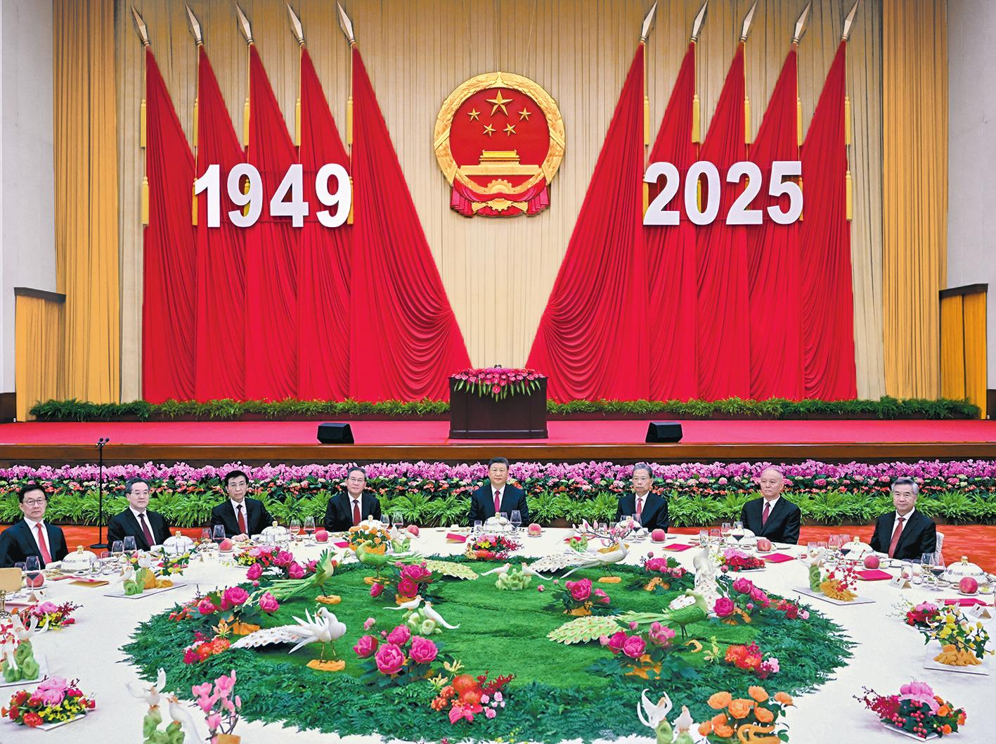 新华社北京9月30日电 庆祝中华人民共和国成立76周年招待会30日晚在人民大会堂举行。中共中央总书记、国家主席、中央军委主席习近平出席招待会并发表重要讲话。他强调,实现中华民族伟大复兴是前无古人的伟大事业。憧憬和挑战,都激发我们只争朝夕、永不懈怠的奋斗精神。我们要更加紧密地团结在党中央周围,锐意进取、埋头苦干,奋力谱写中国式现代化更加绚丽的篇章。 李强主持招待会,赵乐际、王沪宁、蔡奇、丁薛祥、李希、韩正出席招待会。约800名中外人士欢聚一堂,共庆中华人民共和国华诞。 人民大会堂宴会厅华灯璀璨,洋溢着喜庆热烈的节日氛围。主席台上方高悬着庄严的国徽,“1949-2025”大字年号在鲜艳红旗映衬下格外醒目。 17时30分许,在欢快的《迎宾曲》中,习近平等党和国家领导人步入宴会厅,向大家挥手致意,全场响起热烈掌声。 招待会开始。全场起立,高唱中华人民共和国国歌,雄壮的《义勇军进行曲》在大厅回荡。 习近平发表重要讲话。他首先代表党中央和国务院,向全国各族人民、向中国人民解放军指战员和武警部队官兵、向各民主党派和无党派人士致以节日祝贺,向香港特别行政区同胞、澳门特别行政区同胞、台湾同胞和海外侨胞致以诚挚问候,向长期以来关心和支持中国建设事业的友好国家和国际友人致以衷心感谢。 习近平指出,新中国76年来,党领导人民自力更生、接续奋斗,取得彪炳史册的辉煌成就。回望历史,中华民族从濒临危亡走向伟大复兴,一路筚路蓝缕、充满艰辛,也一路豪情满怀、凯歌高奏。前不久,我们隆重纪念中国人民抗日战争暨世界反法西斯战争胜利80周年,极大振奋了民族精神、激发了爱国热情、凝聚了奋斗力量。要继续用好历史经验,把国家建设得更好,让老一辈领导人和革命先烈开创的事业不断欣欣向荣。 习近平强调,今年以来,面对复杂形势,我们进一步全面深化改革,扎实推动高质量发展,着力保障和改善民生,纵深推进全面从严治党,党和国家各项事业取得新进展新成效。下个月,我们党将召开二十届四中全会,研究制定“十五五”规划建议。要紧紧围绕新时代新征程党的中心任务,把“十五五”发展的目标任务和战略举措规划好实施好,确保基本实现社会主义现代化取得决定性进展。 习近平指出,新征程上,我们要坚定不移贯彻“一国两制”方针,支持港澳更好融入国家发展大局,更好发展经济、改善民生。要深化两岸交流合作,坚决反对“台独”分裂行径和外部势力干涉,坚决捍卫国家主权和领土完整。 习近平强调,面对百年变局加速演进的国际形势,我们要大力弘扬全人类共同价值,践行真正的多边主义,推动落实全球发展倡议、全球安全倡议、全球文明倡议、全球治理倡议,同各国携手构建人类命运共同体。 在欢快的乐曲声中,中外宾朋举杯共贺中华人民共和国成立76周年,祝福中国繁荣昌盛、人民幸福安康,祝愿中国人民和世界各国人民友谊长存。 出席招待会的还有:在京中共中央政治局委员、中央书记处书记、全国人大常委会副委员长、国务院副总理、国务委员、国家监察委员会主任、最高人民法院院长、最高人民检察院检察长、全国政协副主席和从领导职务上退下来的同志,以及中央军委委员、曾担任中央军委委员的同志。 中央党政军群有关部门和北京市负责人,各民主党派中央、全国工商联负责人和无党派人士代表,在京功勋荣誉表彰奖励获得者代表,全国劳动模范和先进人物代表,为民族地区稳定、发展、团结作出重要贡献的少数民族代表人士,在京部分香港特别行政区人士、澳门特别行政区人士、台湾同胞和华侨、华人代表,各国驻华使节、各国际组织驻华代表、部分外国专家等也出席了招待会。