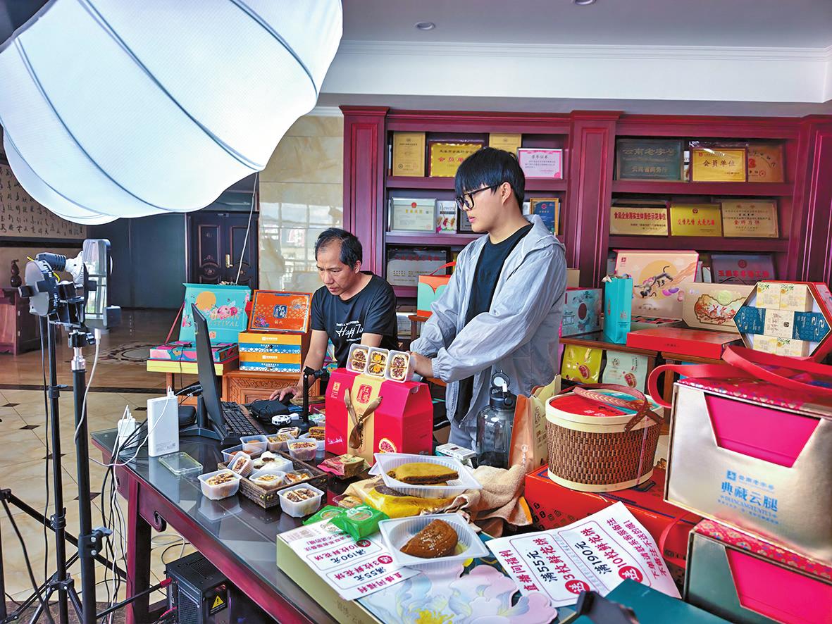 9月28日,在云南红塔食品有限责任公司直播间里,工作人员正在推介月饼。生产车间内,6条自动化生产线不停运转,全力保障月饼市场供应。自9月1日进入生产高峰后,该公司前期日均生产月饼100万个,9月27日后根据订单需求调整为日均生产月饼40万个,整体销量较去年同期增长10%。产品通过线上、线下双渠道销往全国各地,其中火腿馅月饼和鲜花馅月饼凭借独特风味成为热销品。 本报记者 冯天娇 摄