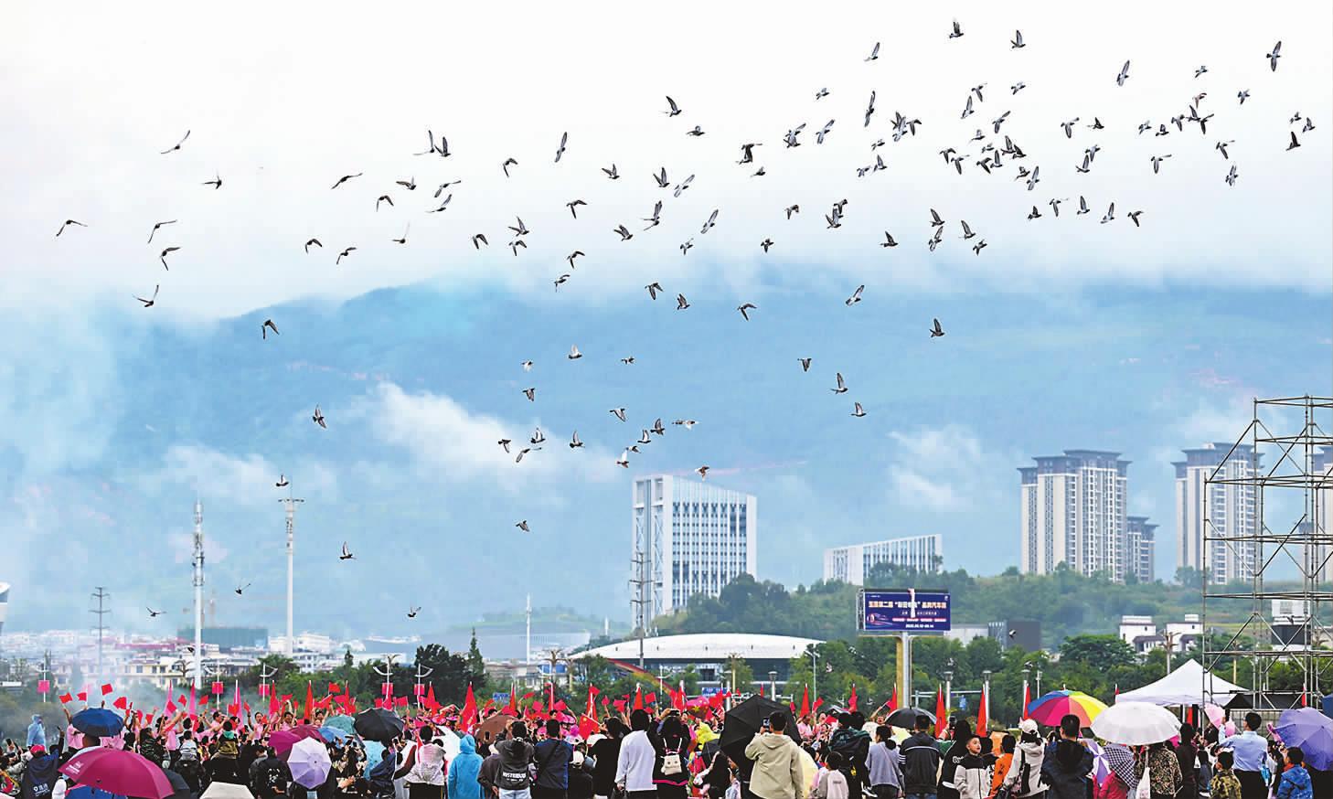 本报讯(记者 白诚颖 曾永洪 文/图)10月1日上午,以“同唱一首歌 同为一家人”为主题的玉溪市2025年“十一”国庆节聂耳故乡“同升国旗·同唱国歌”活动在聂耳广场举行。玉溪社会各界人士、广大市民及部分前来参加玉溪马拉松比赛的外地游客齐聚于此,共同为中华人民共和国成立76周年献上最诚挚的祝福。 升旗仪式前1小时,玉溪聂耳广场下起了雨,然而,雨水丝毫未能阻挡人们观看升旗仪式的高涨热情。大批市民纷纷冒雨赶来,一时间,广场上满是举着雨伞与挥动着小国旗的人们,场面蔚为壮观。79岁高龄的李奶奶来自红河州,此次来玉溪看望女儿,正巧赶上国庆节升国旗,便在女儿陪伴下一同到聂耳广场感受这庄重热烈的氛围。 上午9时,细雨依旧淅淅沥沥,玉溪消防聂耳广场国旗护卫队迈着整齐划一、铿锵有力的步伐,沿着中轴线稳步前行。在上万群众饱含期待与崇敬的目光里,他们昂首挺胸、精神抖擞地护卫着五星红旗走向升旗台。当激昂的《义勇军进行曲》奏响,五星红旗迎着风雨冉冉升起,现场观众全体肃立,齐声高唱中华人民共和国国歌。歌声响彻广场,鲜艳的五星红旗在广场上空高高飘扬,浓浓的爱国情怀在每一个人心中油然而生,并在广场上弥漫开来。 “前不久刚看过阅兵,今天又亲历国庆节升国旗,真的非常震撼,我感到无比骄傲!”第一次到聂耳广场观看升旗仪式的玉溪师范学院附属小学四年级学生周乐芸兴奋地告诉记者,“回家后一定要把这次观看升国旗的经历记录下来,因为这是一件非常有意义的事。”市民周燕为了让女儿接受爱国主义教育,特意带着她穿着雨衣在广场上等待了一个多小时。周燕表示,希望能从小培养女儿的爱国情怀,长大后做一个热爱祖国、正直诚实、勤劳勇敢的人。 升旗仪式结束后,《盛世欢歌》《崴灯》《向往》等精彩的文艺节目在聂耳广场依次展演。缤纷的彩虹礼炮绽放,一群和平鸽展翅高飞,将整个活动推向高潮。 |