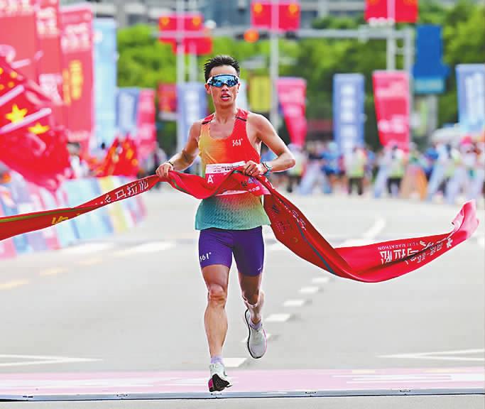 全程马拉松男子组冠军管油胜冲线瞬间。
