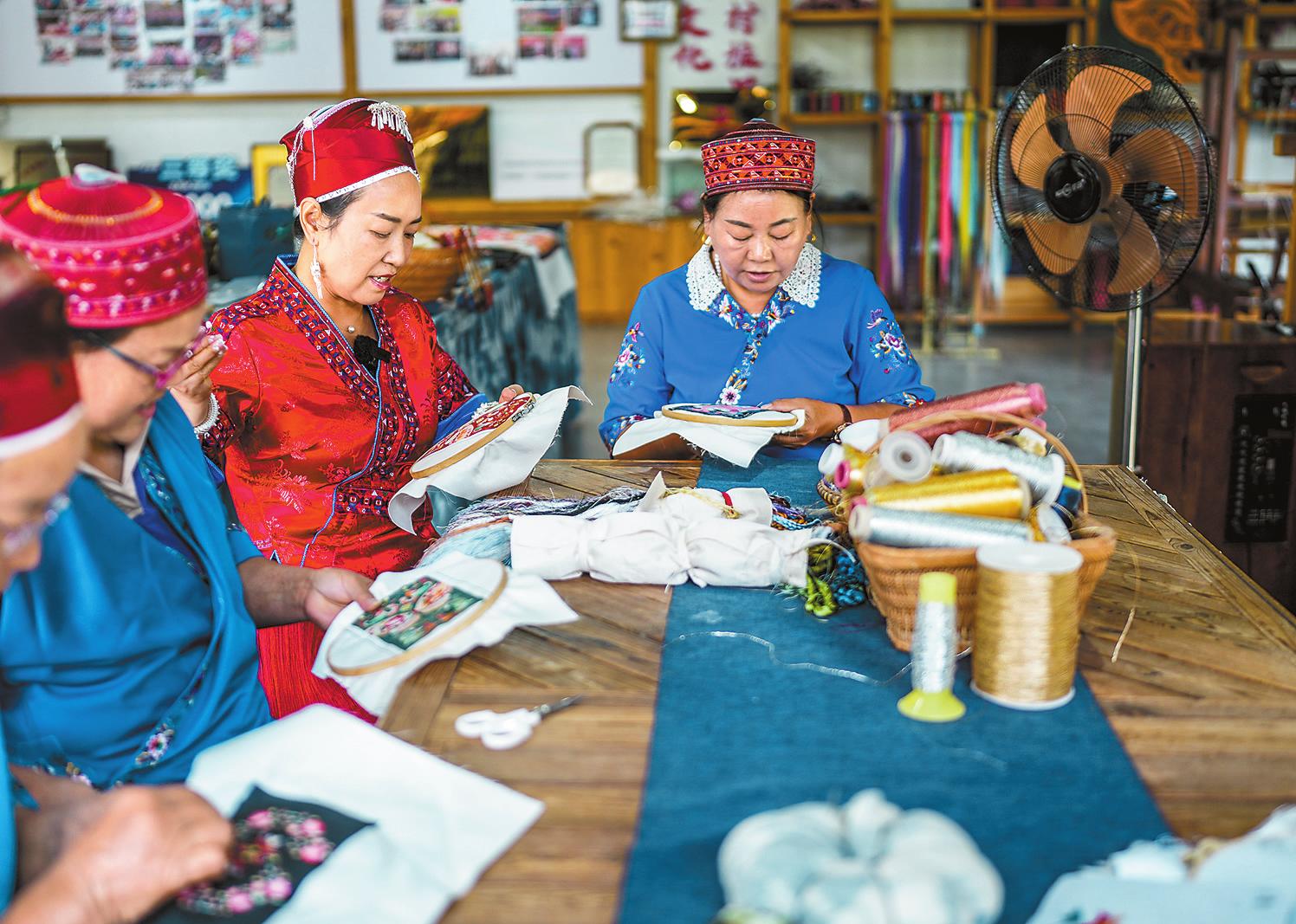 龙禄颖(左三)在位于贵州省施秉县的舞水云台非遗工坊进行刺绣创作(10月10日摄)。