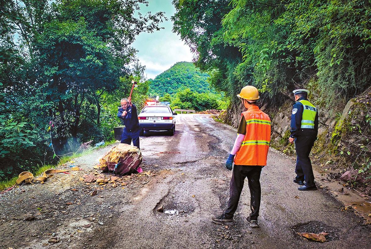 近日,新平县公安局新化派出所民警在公戛线路段开展道路交通违法查处时,发现一块大石头滚落在路中央,严重影响车辆通行。民辅警立即下车,准备将石头搬到路边,但由于石头太大太重,只能通知道路管护人员带着器材到现场。待管护人员带着大锤、绑带等工具到达现场后,民警高高举起大锤,经过十余分钟的击打,最终将大石头砸碎并搬至路边,恢复道路畅通。