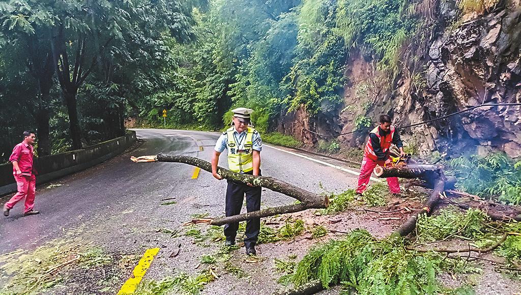 10月10日,受连续降雨影响,国道213线元江县热水塘景区路段突发山体落石,滚落的碎石与倾倒的树木占据半幅路面。随后,元江县公安局交管大队民辅警和公路养护人员一起清理路面落石、树木,经过1小时工作,道路恢复正常通行。 通讯员 白晓龙 摄
