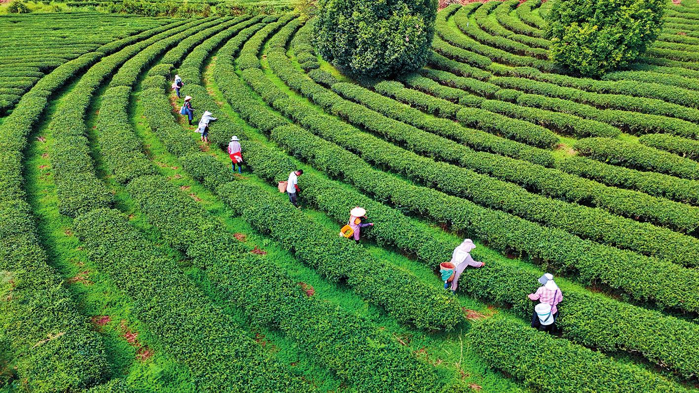 10月22日,茶农在云南省普洱市宁洱哈尼族彝族自治县宁洱镇般海村采茶(无人机照片)。