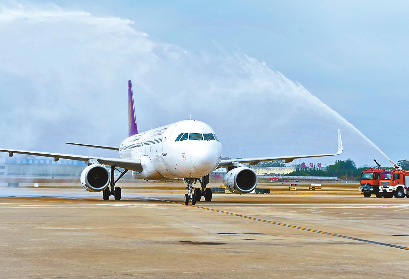 10月26日,从金边飞来的柬埔寨国家航空的客机抵达福州长乐国际机场时举行过“水门”仪式。 10月26日,福建省首条第五航权客运航线“金边-福州-东京”航线正式启航。第五航权指一个国家的航空公司在经营某条国际航线的同时,获得在第三国经停并载运客货的权利。普通国际航线一般在两个国家间通航,一旦开放第五航权,则意味着航空公司可以在第三国载运客货,实现三个国家之间运输。该航线将柬埔寨金边、中国福州以及日本东京紧密相连,对于促进三国经贸文化交流合作以及区域经济发展等具有重要意义。 新华社记者 林善传 摄 (新华社10月26日发) |