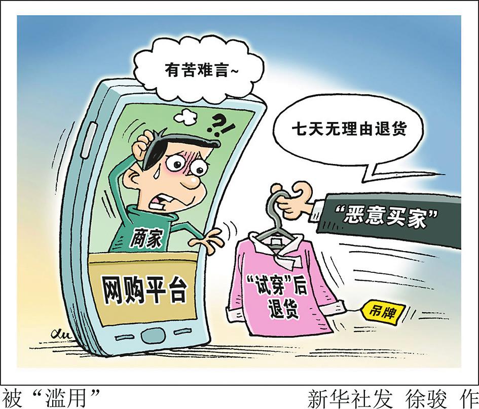 更令人担忧的是,某些人长期专门钻这项规则的漏洞,沦为“退货党”,还培育出灰色产业链。买真退假、买新退旧、买好退次,而且教唆骗赔、伪造凭证,将好好的消费维权规则,硬生生变成了牟利通道。徐骏/作(新华社11月11日发)