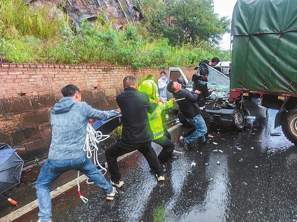 本报讯(通讯员 伍继欣 谢学礼文/图)11月2日8时许,大雨滂沱,峨山县公安局岔河派出所接到群众报警,易峨高二级路摆依寨附近发生交通事故,急需救援。 接警后,民警迅速赶赴现场。事发地在摆依寨附近长下坡急转弯路段,一辆微型车车头严重变形,驾驶员被卡在驾驶室内无法动弹,伤势不明。民警一边安抚驾驶员,一边联系120急救及119消防救援力量。初步勘查发现,驾驶员虽因车辆挤压无法活动,但意识清醒,无胸闷、恶心等不适情况。在场群众尝试使用常规破拆工具施救,但因驾驶室变形严重,未能打开救援空间。 时间一分一秒过去,民警在安抚驾驶员的同时,仔细观察车辆结构,在确保操作不会对驾驶员造成二次伤害的情况下,果断提出采用牵引扩张的方法展开救援。在民警的协调下,热心群众迅速找来绳索,大家将绳索一头固定在车辆A柱及其他牢固部位,另一头由众人合力拉拽。“一、二、三,拉!”伴随着整齐的口号,民警与群众齐心协力,慢慢将变形的车头拉出缝隙。 “动了,有用!”驾驶员身体能够轻微移动,让大家看到了希望。然而,就在继续施救时,拉拽的绳索突然断裂。民警迅速将断裂的绳索对折加固,热心群众也找来更粗的绳索。大家重新固定绳索,分成两拨人同时发力。“一、二、三,拉!”在警民的齐心努力下,终于将冰冷的车架拉开足够空间。救援人员瞅准时机,小心翼翼地将驾驶员从驾驶室抬出,转交给在现场等候的120急救人员送往医院救治。 后经了解,驾驶员仅左脚因挤压导致骨折,无其他重大伤情,目前情况稳定。 此次救援,展现了峨山警方民辅警沉着应对、果断处置的专业素养,更体现了警民同心、守望相助的深厚情谊。 警方提醒:广大驾驶员行经长下坡、急弯等复杂路段时,请提前检查车辆制动系统,控制车速,保持安全距离,确保行车安全。 |