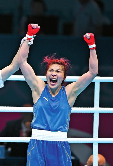 | 11月12日,禹立赛在夺冠后庆祝。当日,在深圳进行的第十五届全国运动会拳击女子66公斤级决赛中,北京体育大学队选手禹立赛战胜河南队选手李书,获得冠军。 新华社记者 杨冠宇 摄 |