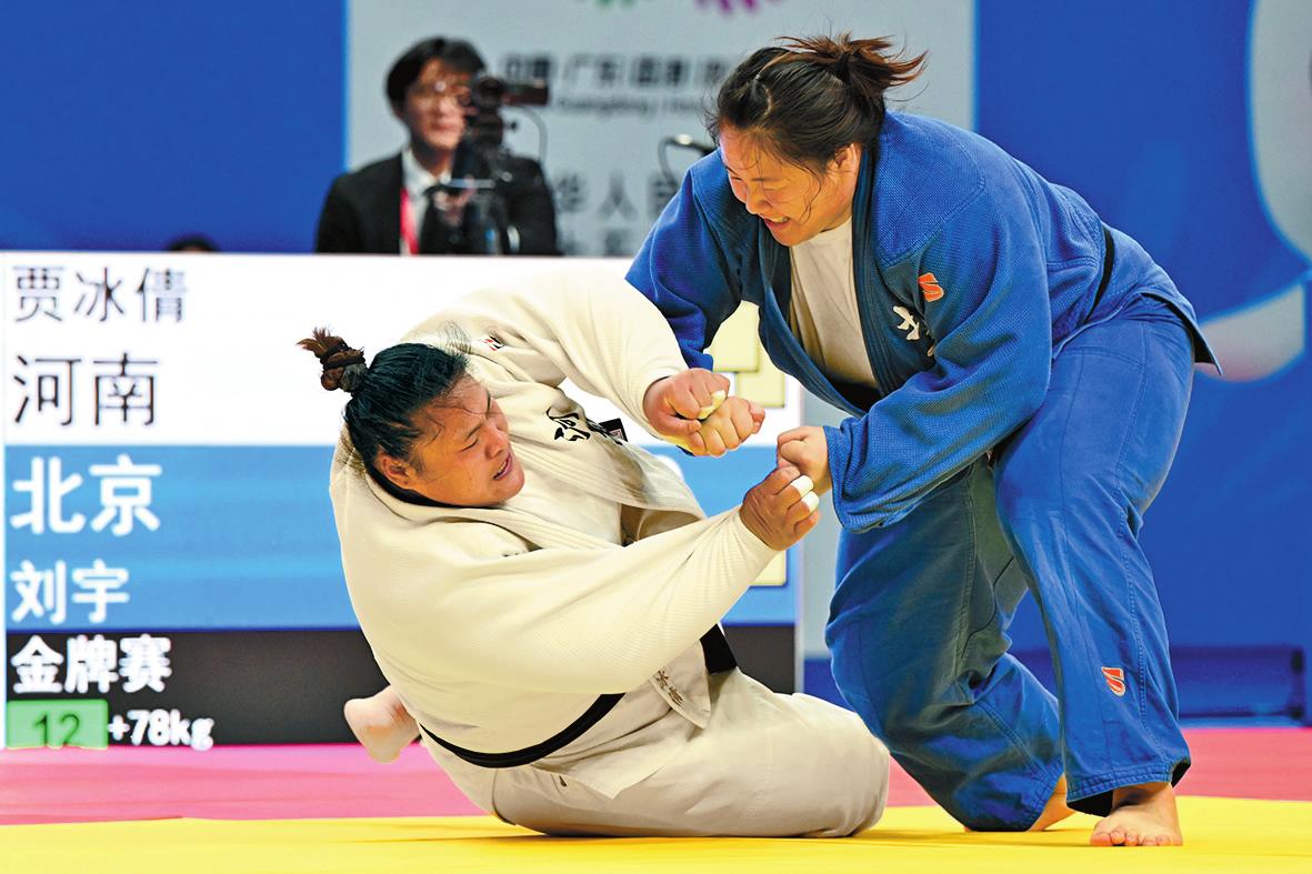 | 11月12日,北京队选手刘宇(右)和河南队选手贾冰倩在女子78公斤以上级金牌赛中。最终,刘宇战胜贾冰倩夺得冠军。当日,第十五届全国运动会柔道项目女子78公斤以上级金牌赛和铜牌赛在广东省肇庆市举行。