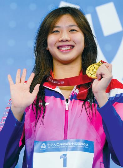 | 11月12日,冠军上海队选手唐钱婷在颁奖仪式上。当日,第十五届全国运动会游泳女子100米蛙泳决赛在广东省深圳市举行。
