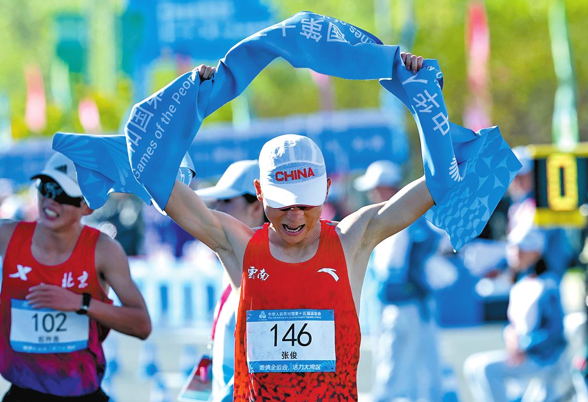| 11月12日,云南队选手张俊在比赛中第一个冲过终点后庆祝。当日,第十五届全国运动会田径项目男子20公里竞走决赛在广东珠海举行。