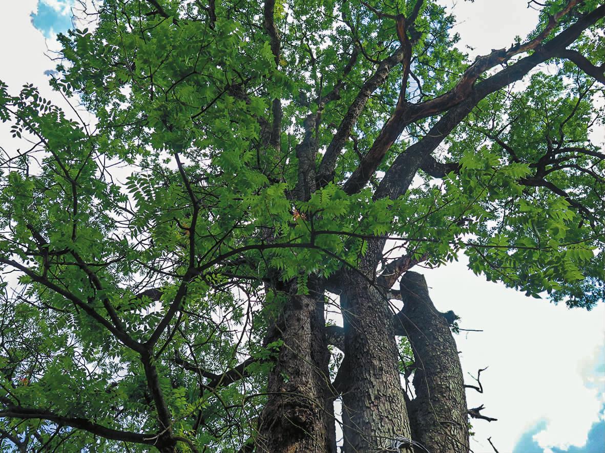 本是同根生的奇树 从桥上走过村口的龙洞河,记者看到了那两棵并肩而立的古树。左边那棵枝丫虬结,每年春天都会开出金黄如蝶的花,结出形似豌豆的果实;右边那棵却终年静默,无花无果,只以葱茏枝叶与左边的树相望。村民将两树合称为“龙凤树”,左为龙树,右为凤树。 “黄牛头树”是龙凤树的土名,当地没人说得清学名究竟为何。张启平记得,祖父曾说这两棵树“比村子年纪还大”,粗略推算树龄已超三百年。最奇特的是,龙树的果实虽不可食用,却能在青果期散发出淡淡松香,村民常捡来置于窗台驱虫;凤树则被视为“祥瑞之兆”,谁家添丁或娶媳妇,必在树下设宴请客。 除了龙凤树,鸡蛋村周边还分布着三四十棵百年古树,黄连木占了大半,间杂着清香木、麻栎树。黄连木树干粗糙如铠甲,木质坚硬细密,村民早年用其制作成农具的木把柄,斧头把用黄连木做的,十年都不开裂。清香木叶片揉搓后散发柑橘香,旧时孩童常摘来当“天然香料”,如今村里的清香木古树成了省级保护植物。麻栎树果实可磨粉制豆腐,树皮曾是染布的天然原料。