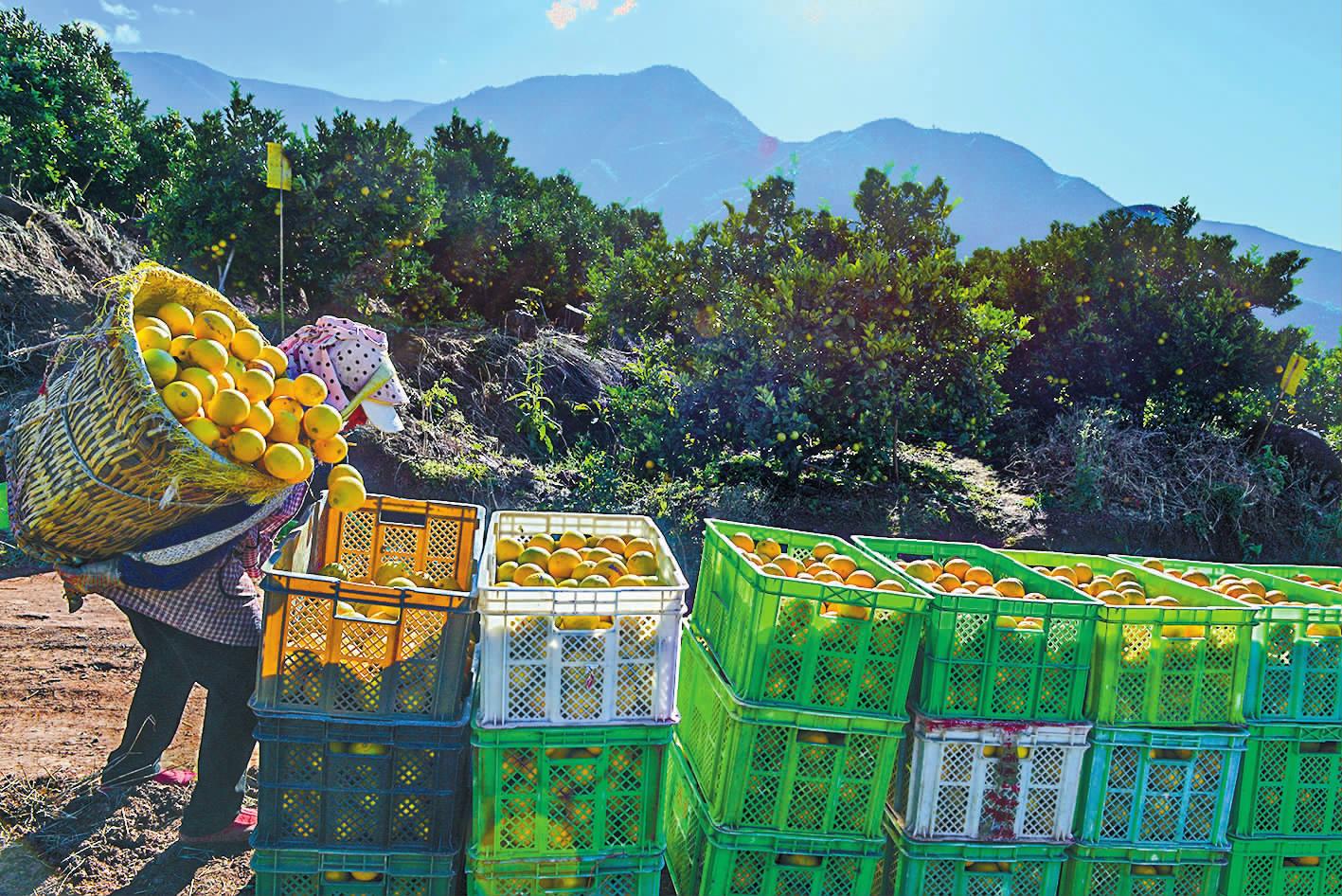 11月12日,峨山县富良棚乡婀娜村,工人把甜橙从地里背到路边等待装运到选果厂。婀娜村把产业振兴作为乡村振兴的关键来抓,2015年引进公司与村委会合作创办柑橘基地,已累计投入6000万元,流转土地种植4000亩甜橙,村集体和流转土地农户每年可获得分红及土地流转收入,基地还吸纳了近百名固定工人和200多名季节工人,给当地群众增加了可观收入。目前,已有3400亩甜橙进入盛果期,预计产量4500吨,产品多销往海外。 本报记者 崔永红 摄