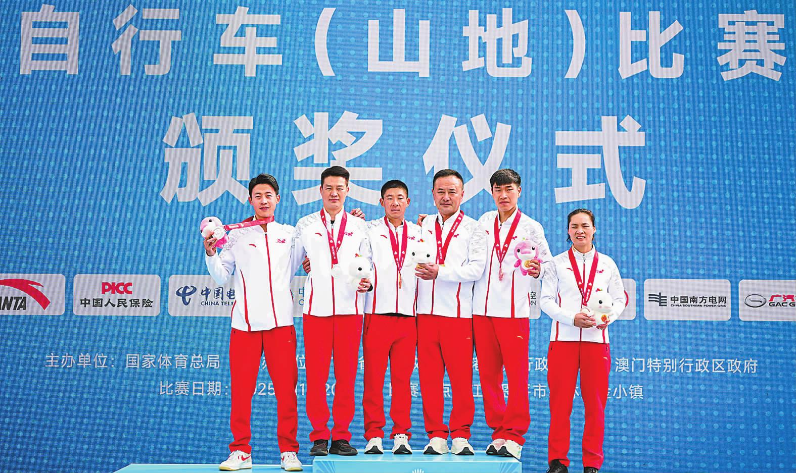 11月20日,冠军云南队选手吕先景(左三)、亚军云南队选手袁金伟(左一)和季军云南队选手何学辉(右二)与教练在颁奖仪式上。当日,在广东江门举行的第十五届全国运动会山地自行车男子越野赛决赛中,云南队选手吕先景、袁金伟和何学辉分获冠、亚、季军。